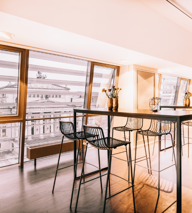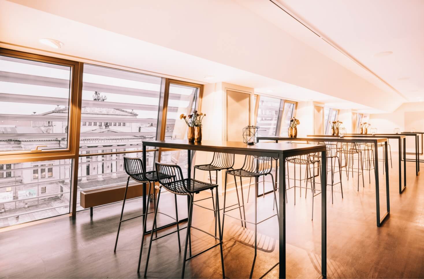 Stilvolle, wandelbare Räume für Firmenevents mit erstklassigem Catering und beeindruckendem Stadtblick.